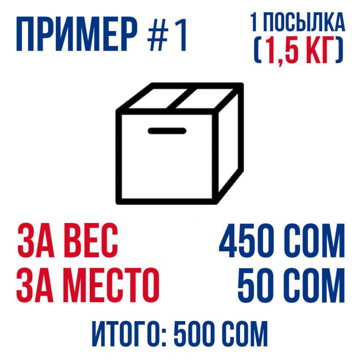 1. У вас 1 посылка (1 место) весом 1,5 кг. Вы оплатите 50 сом за место и 450 сом за вес. Итого 500 сом