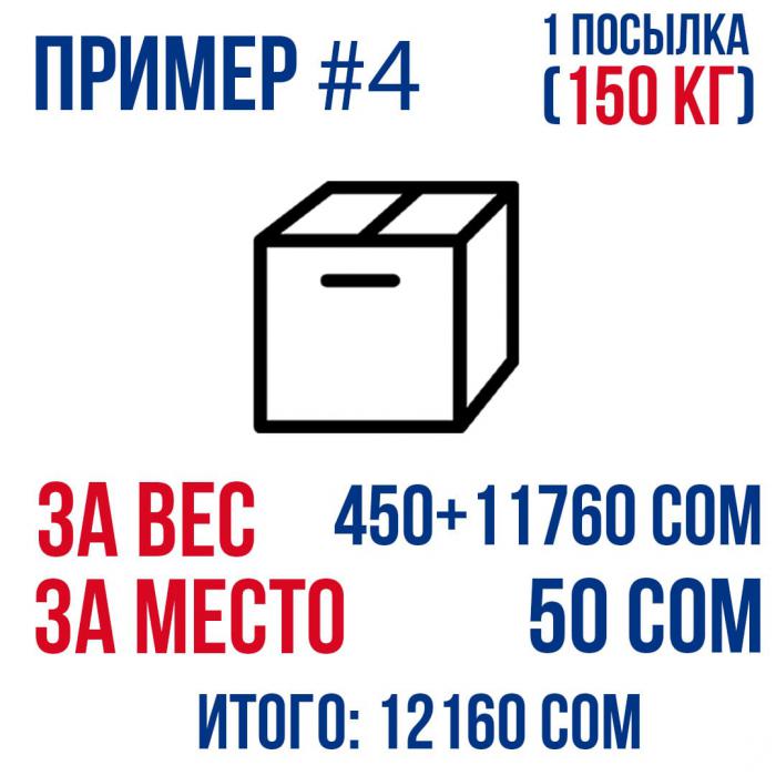 4. У вас 1 посылка (но 3 места) весом 150 кг. Вы оплатите 150 сом за место и 450 сом+13230 сом (147 кг*90 сом) за вес. Итого 13380 сом