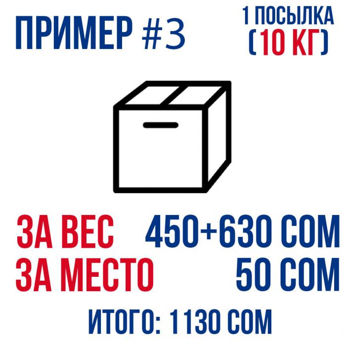 3. У вас 1 посылка (1 место) весом 10 кг. Вы оплатите 50 сом за место и 450 сом+630 сом (7 кг*90 сом) за вес. Итого 1130 сом