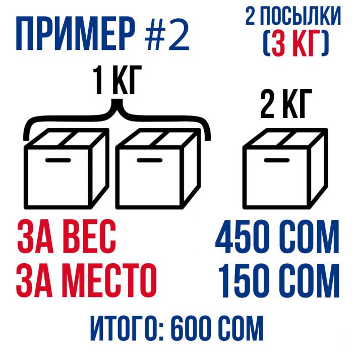 2. У вас 2 посылки (но 3 места). Одна весом 1 кг, другая 2 кг. Вы оплатите 150 сом за место и 450 сом за вес. Итого 600 сом